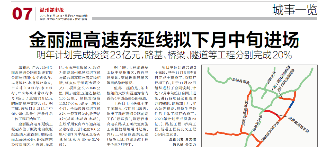 金丽温高速东延拟下月中旬进场