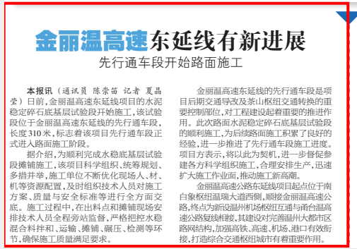 金丽温高速东延线有新进展 先行通车段开始路面施工