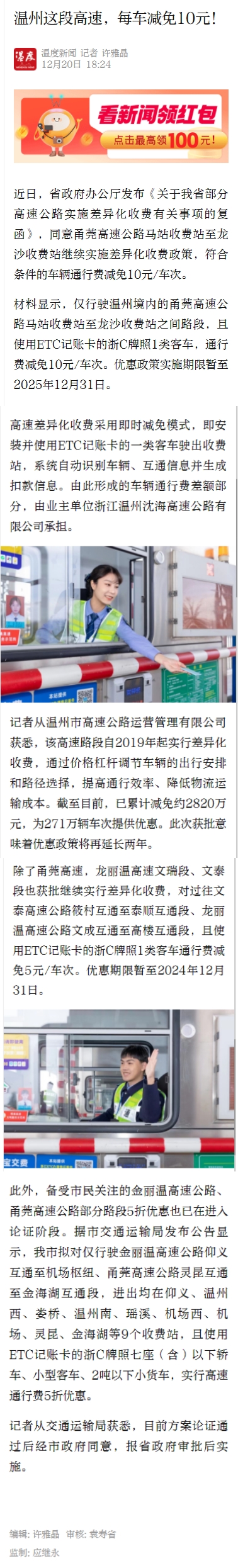 温州这段高速,每车减免10元!