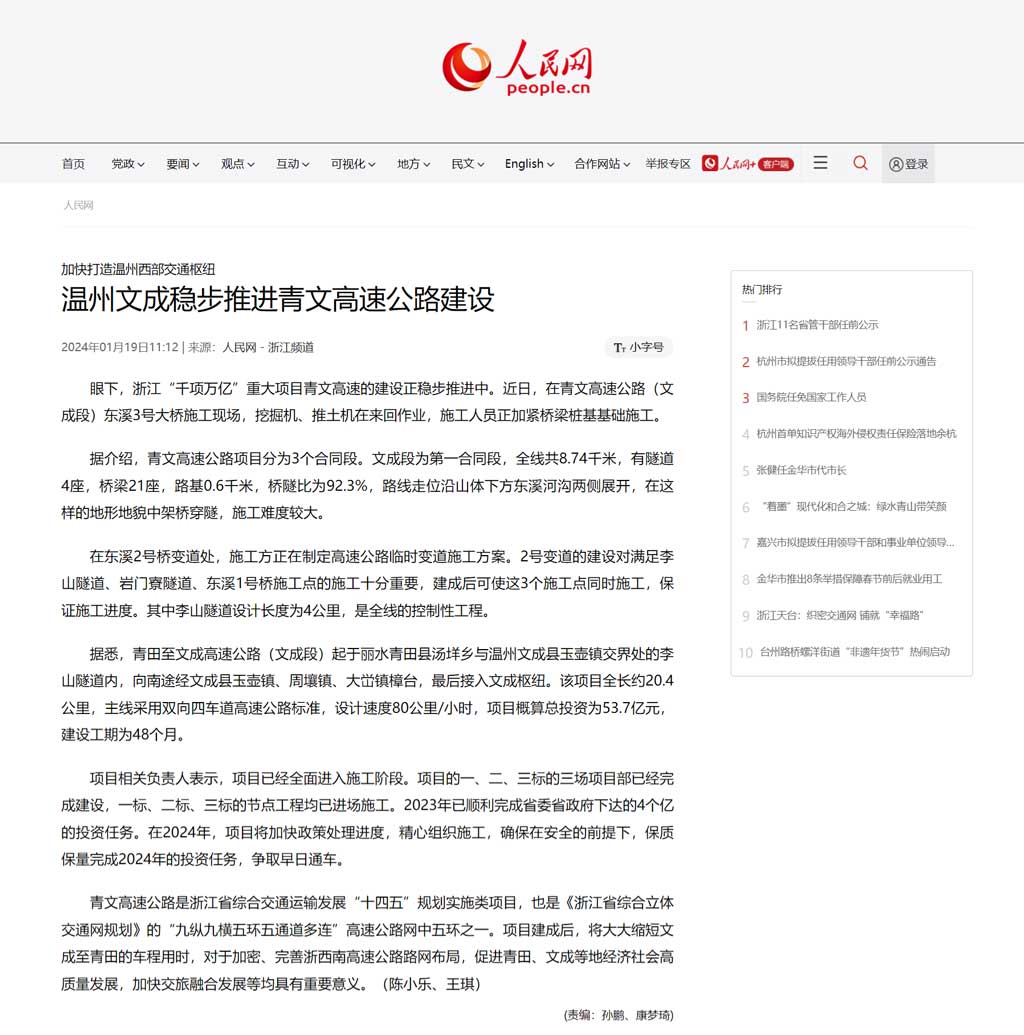 加快打造温州西部交通枢纽 温州文成稳步推进青文高速公路建设