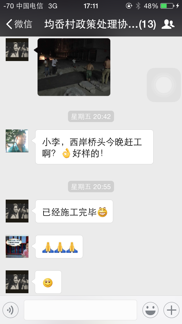 这是绕西南工程6标项目现场技术员李法利与地方村委在政策处理微信群里的对话,群里共享了现场已经处理完成的照片,实时发布了问题的解决情况。