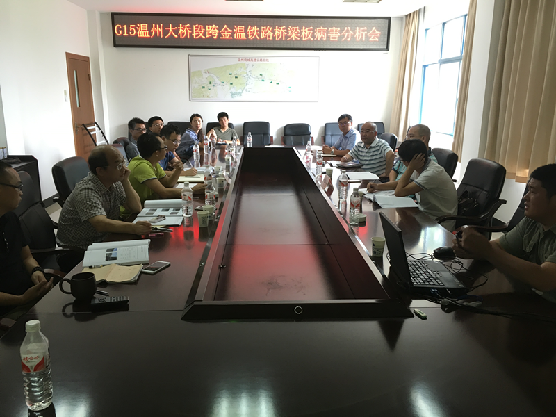 2016年8月18日上午,绕城分公司在永嘉黄田绕城高速管理中心二楼会议室组织召开G15(沈海)高速公路温州大桥温州大桥段跨金温铁路桥梁板病害分析会。参加会议的有温州市交投集团、中交第一公路勘察设计研究院有限公司、温州信达交通工程试验检测有限公司等单位的代表和特邀专家。
