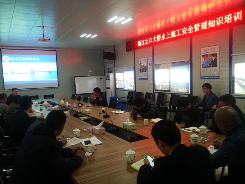 3月30日上午,温州瓯江口大桥有限公司邀请温州海事局乐清湾海事处大队长万成考、副大队长郑来国,对温州瓯江北口大桥项目所有监理办和项目部的主要负责人、生产和安全分管负责人、工程和安全管理员等相关人员共22人进行了水上施工安全管理培训。