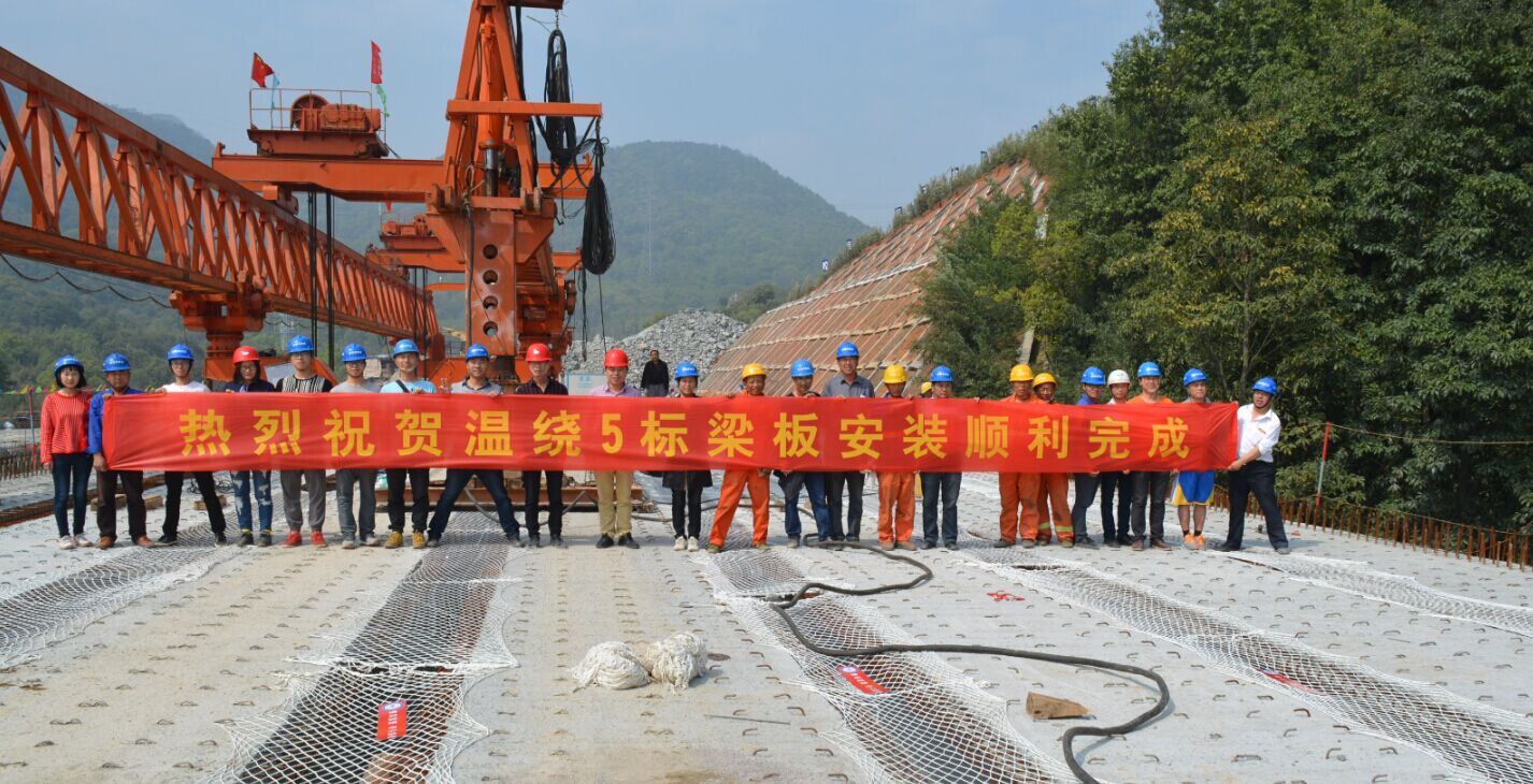 5标共有3座桥梁,T梁共计686片。进场伊始,受政策处理影响,桥梁工程工作面迟迟未能打开。2016年政策处理局面打开后,在项目部周密部署以及各方的通力合作下,5标奋起直追,走在时间前面,以月均产梁90片速度于2016年底完成梁板预制;梁板安装更是快马加鞭,以1天1跨的速度完成桐西大桥和桐溪2#大桥,保质保量,顺利完成桥梁工程各项任务,给予了建设者们莫大的鼓励。