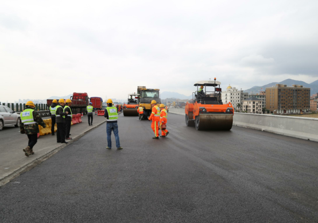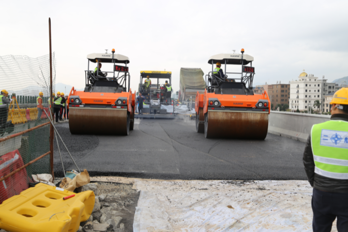 1月3日上午10点,甬台温3标路面工程试验段沥青摊铺机开始抬板,进行桥面下面层sup-20摊铺,耗时两个半小时,于下午1点30分完成路面碾压,试验摊铺顺利完成。本次路面试验段为乐清高架桥右幅(福州向)共307.9米。