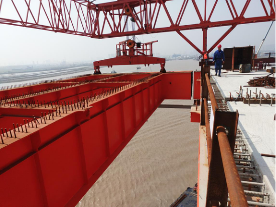 鳌江特大桥北岸用桥面吊机安装首片钢主梁顺利完成