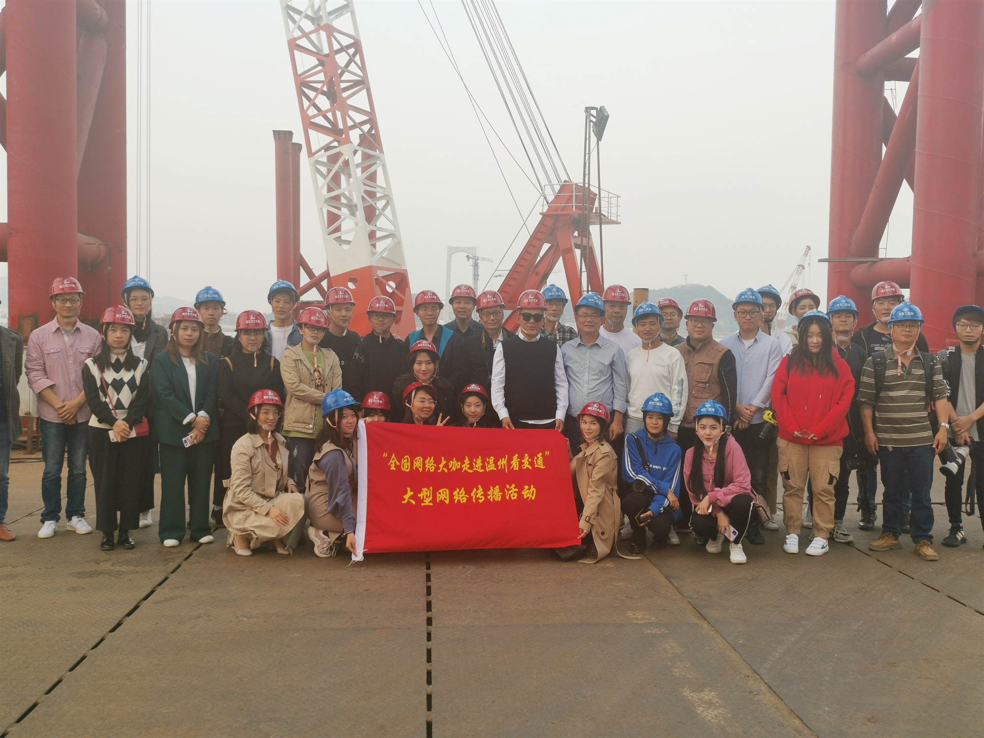 11月14日下午, “全国网络大咖走进温州看大交通”大型网络传播活动来到温州瓯江北口大桥项目现场参观,来自全国50多位网络大咖参加活动。在市交通运输局副局长邱向真的陪同下,一行人参观了温州瓯江北口大桥的项目施工现场,在项目南塔施工区,听取了关于项目概况、建设进度、工程亮点及产业工人等方面的介绍。对于温州瓯江北口大桥的三个世界首创及技术难点,网络大咖们纷纷表示惊叹,“感受到中国速度、中国崛起、中国实力!”随后,各网络大咖在工地现场进行拍摄采风、直播宣传并合影留念。