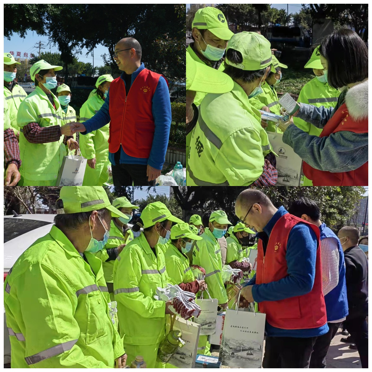 3月8日,党团志愿者为龙湾区的志愿者送去医用口罩、酒精喷雾、手套等防疫用品物资。