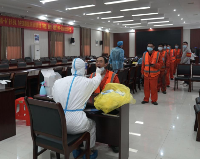 同时另一组“红马甲”前往土建三标项目部,组织工人和职工进行核酸检测,为疫情防控工作做贡献,为北口通车保驾护航。