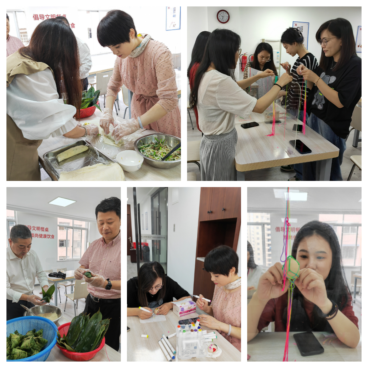 活动中,大家纷纷大展身手,卷粽叶、填糯米、放蜜枣,再用细绳一绕、一捆,动作娴熟,转眼间一个个有棱有角的粽子便呈现在眼前。与包粽子一样,编香袋、绘彩蛋也是端午节的传统习俗,大家编制出五颜六色、形态各样的香袋,还有活灵活现的冰墩墩彩蛋,现场欢声笑语,大家互相学习传统包粽子技能,编织香袋,在分享中收获快乐,在欢乐中共度端午。