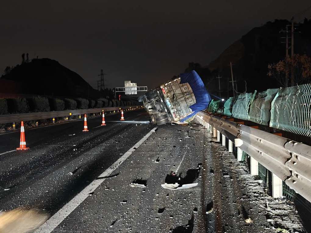 1月30日凌晨,台州方向K1750+200处突发险情:因路面湿滑,两辆货车发生追尾后侧翻,车身受损严重,现场一片狼藉。万幸的是,经初步确认,事故未造成人员伤亡。