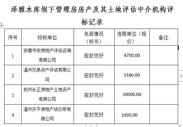 根据市国资委《温州市市属国有企业评估中介机构预选库内二次竞价指导规程》的相关要求,集团公司组织成立评标小组于2021年8月27日上午10点整在温州市泽雅水库管理站二楼会议室进行公开选聘。评标小组对收到的4份响应标书进行密封检查和综合评定,按照价低的原则,最终选定温州天平房地产估价有限公司为该项目评估单位,评估报价合计1920.00元。(附件)