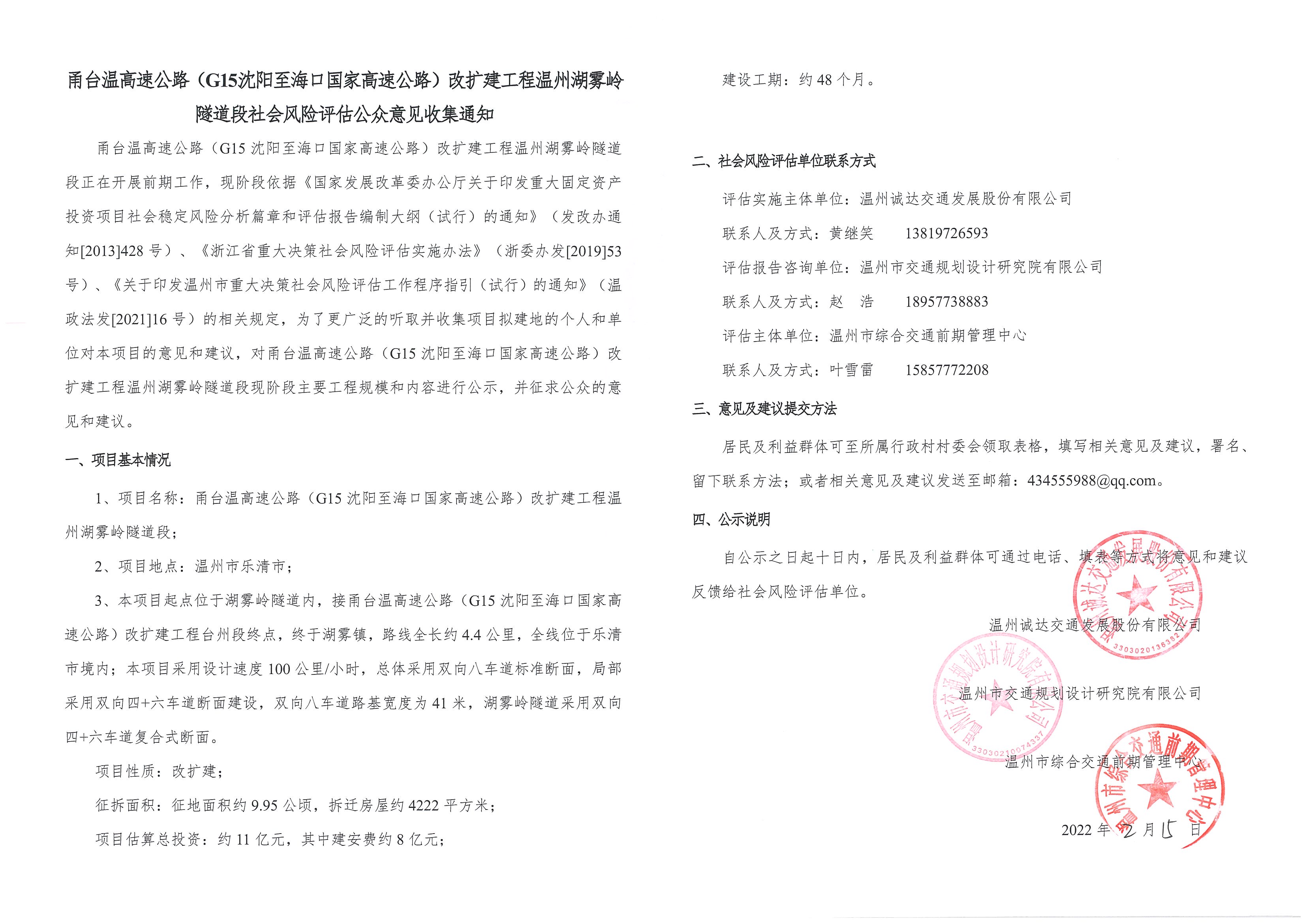甬台温高速公路(G15沈阳至海口国家高速公路)改扩建工程温州湖雾岭隧道段社会风险评估公众意见收集通知