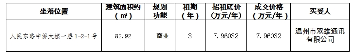 温州房地产开发股份有限公司就温州市鹿城区人民东路中侨大楼一层1-2-1号商业用房三年租赁权于2024年9月18日至9月30日进行公开招租,经评估机构评估、委托产权交易中心拍卖及公开竞价并按相关程序审批,已完成公开拍卖,现将拍卖结果公示如下: