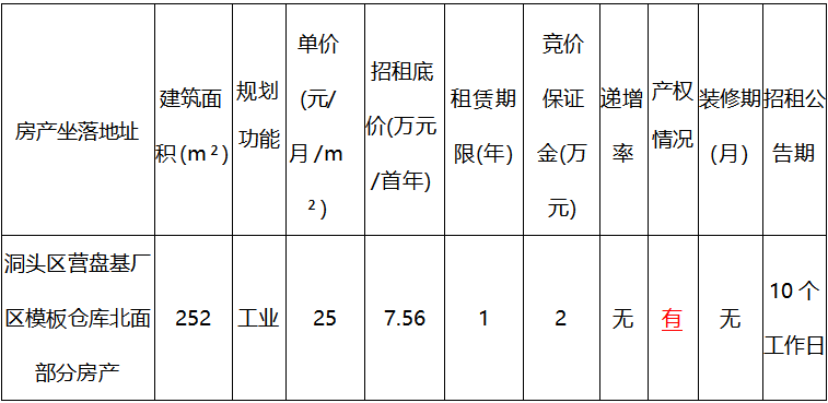 现委托温州联合产权交易中心有限公司,通过“浙交汇”平台对以下标的租赁权进行“网络动态报价”式交易,于2024年12月6日至2024年12月19日开始自由报价, 2024年12月20日10时整开始限时报价,具体事宜详见“浙交汇”网站项目信息披露。