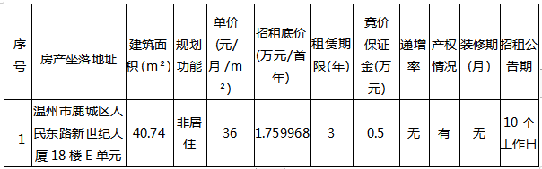 betway西汉姆联官方网站经营公司关于温州市鹿城区人民东路 新世纪大厦18楼E单元办公房三年租赁权交易公告