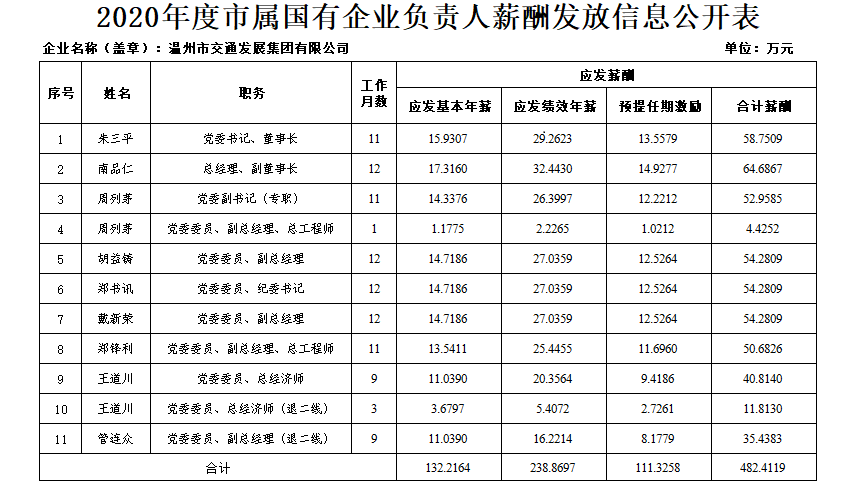 2020年度市属国有企业负责人薪酬发放信息公开表
