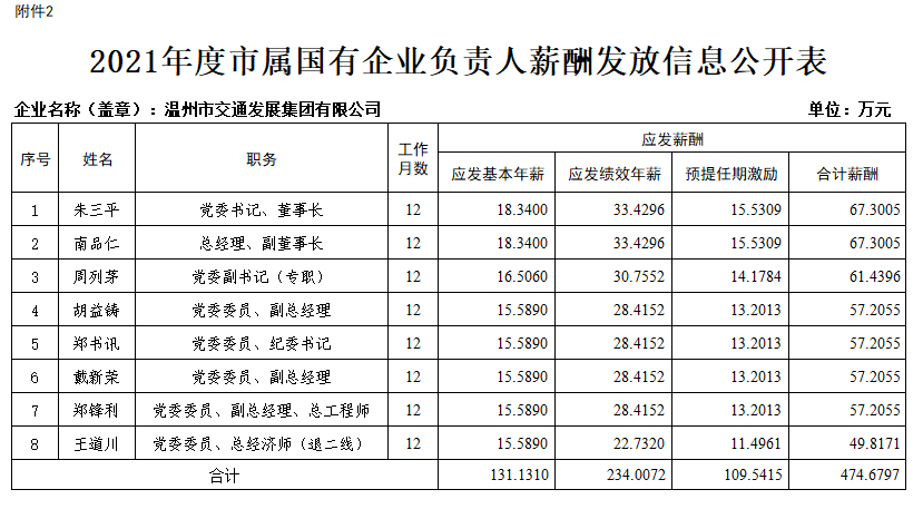 2021年度市属国企负责人薪酬发放信息公开表
