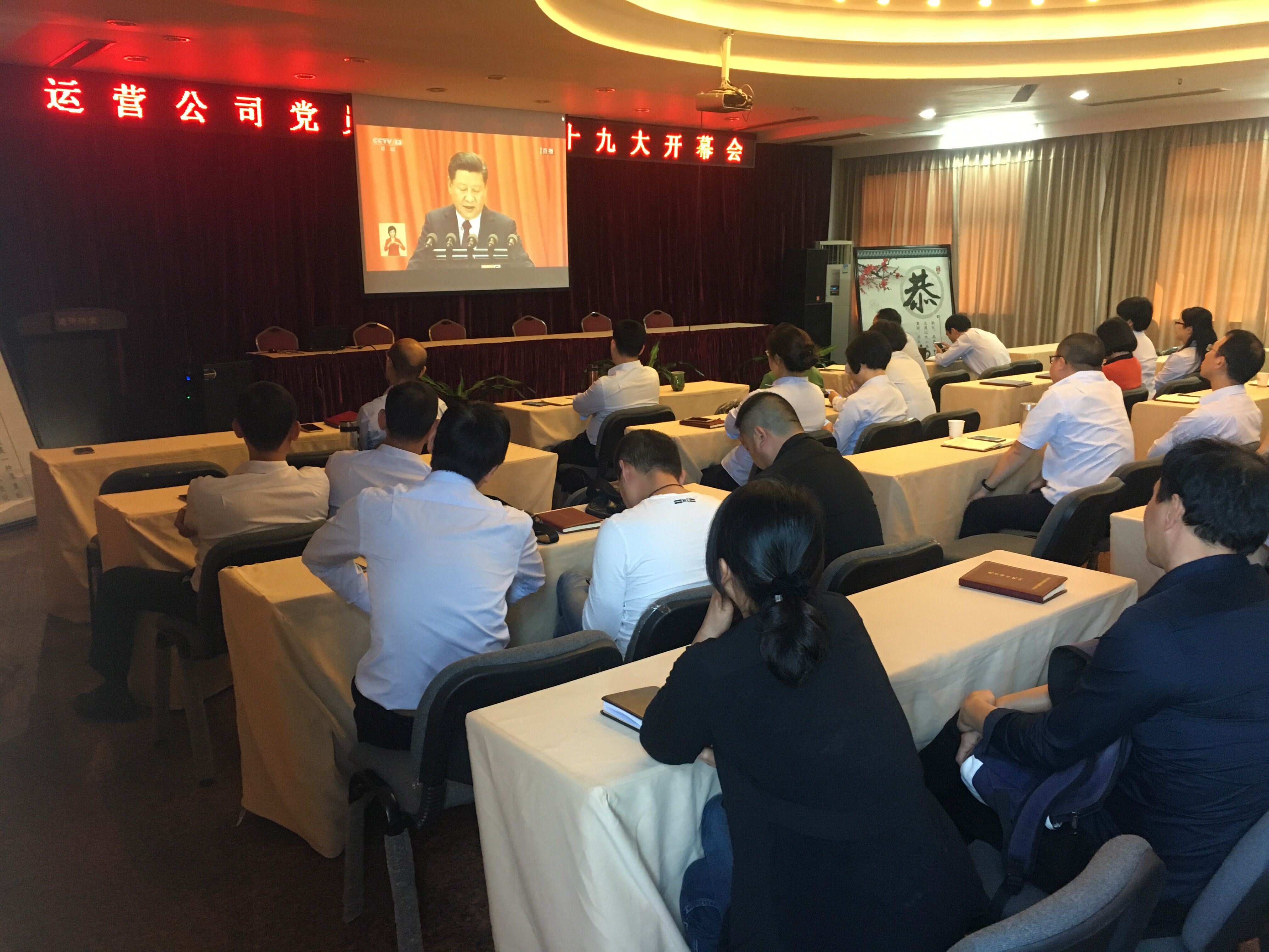 为迎接庆祝十九大召开,运营公司党总支于10月17日组织召开了部署会,就如何收看十九大开幕会和开展学习、领会、贯彻十九大精神作了精心部署。18日上午9时整,全体党员集中公司5楼会议室,济济一堂、精神振奋,每一个人都沉浸在喜迎十九大胜利召开的浓厚氛围里。整整3个小时30分钟的开幕会直播节目,大家聚精会神听报告、全神贯注作笔记。