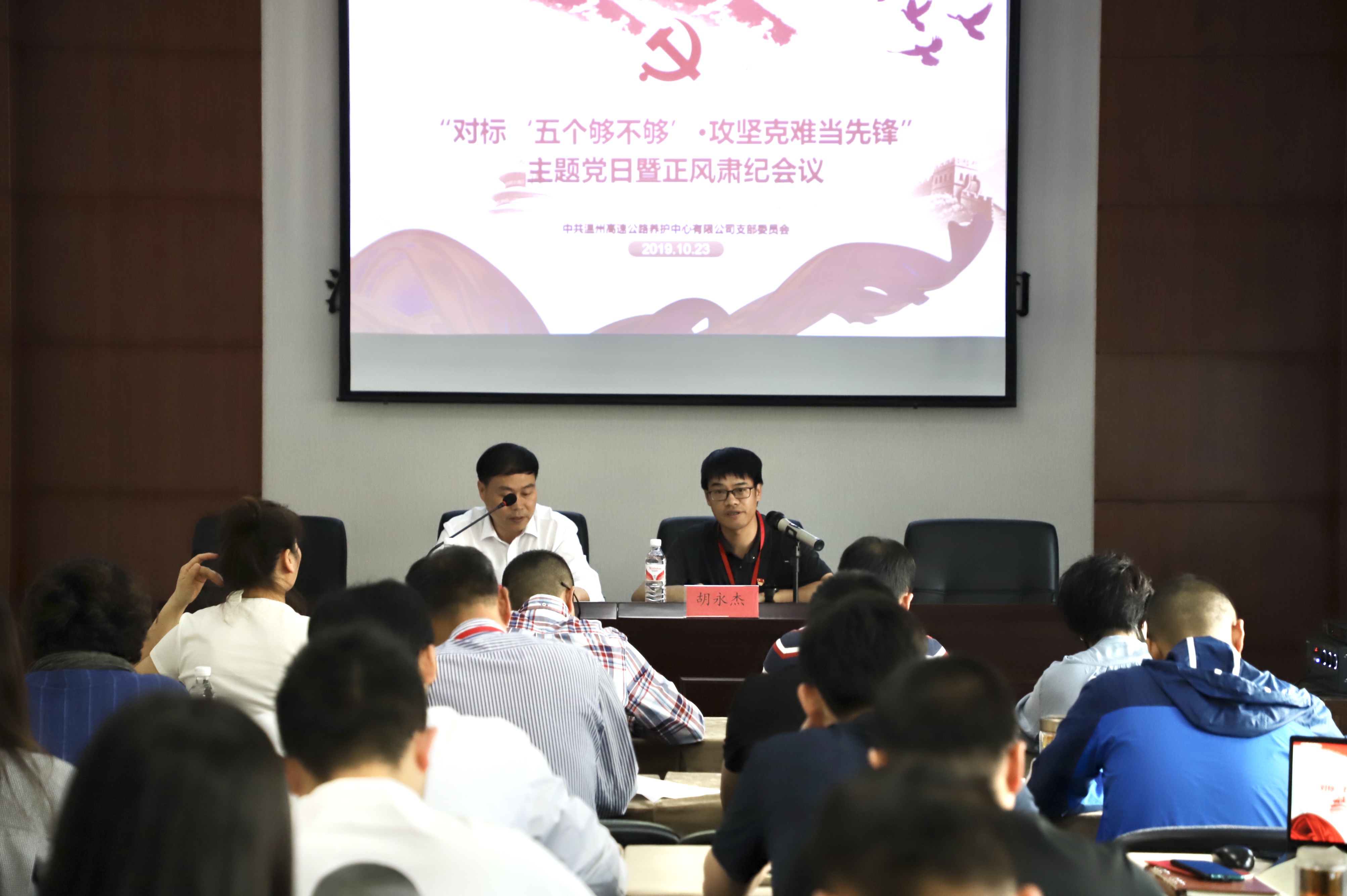 10月23日下午,在养护中心一楼会议室召开“对标‘五个够不够’·攻坚克难当先锋”主题党日暨正风肃纪巡查“回头看”动员大会,会议由胡永杰主持,交投集团监察室全体人员,养护中心全体党员、积极分子,中层干部,工团代表参加会议。