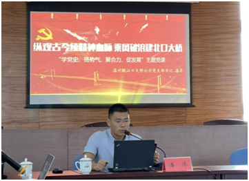 签订“联学共建”协议后,双方党员深入交流探讨了党建工作亮点举措、党建工作心得等。最后,瓯江口大桥公司支部书记潘济以“追溯百年”为主线,围绕“学党史、扬势气,聚合力、促发展”主题,带领双方单位的党员共同回顾百年历史瞬间:对比八国联军侵华、志愿军抗美援朝、新冠肺炎疫情下我国保持经济增长等事例,展现“党始终不断凝聚人民的意志,让中国无往不胜”;对比早期共产党组建、红军长征、脱贫攻坚战、新冠肺炎抗战等事例,展现百年来“党始终敢于牺牲自己,让中华民族伟大复兴”的精神。
