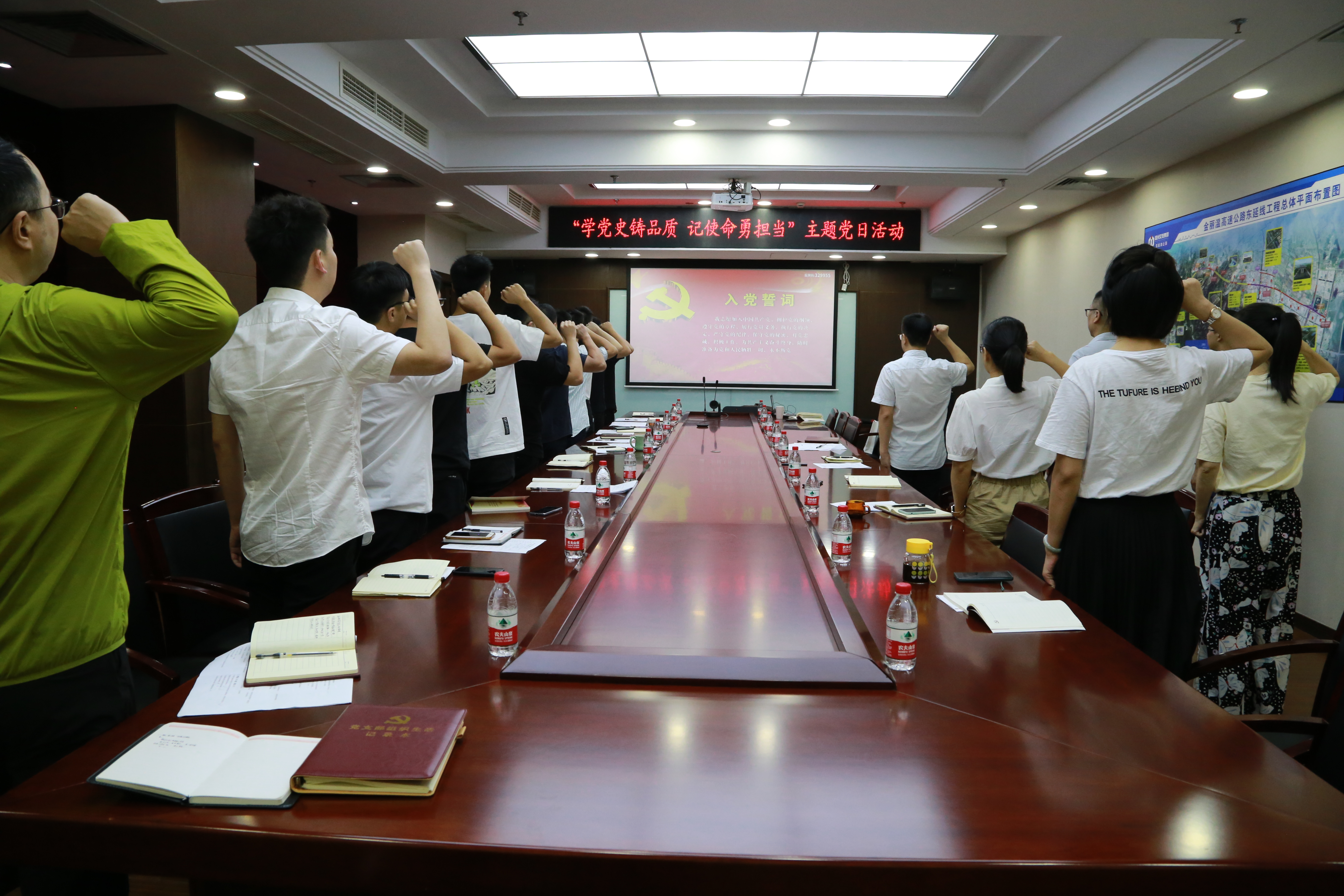 全体党员重温入党誓词,庄重宣誓,坚定初心使命。随后党员代表林友当讲述了以《不忘初心 坚守底线》为主题的微党课,他结合自身从业经验,围绕入党初心、交通建设初心和如何建设百年品质工程与大家进行了分享和交流。