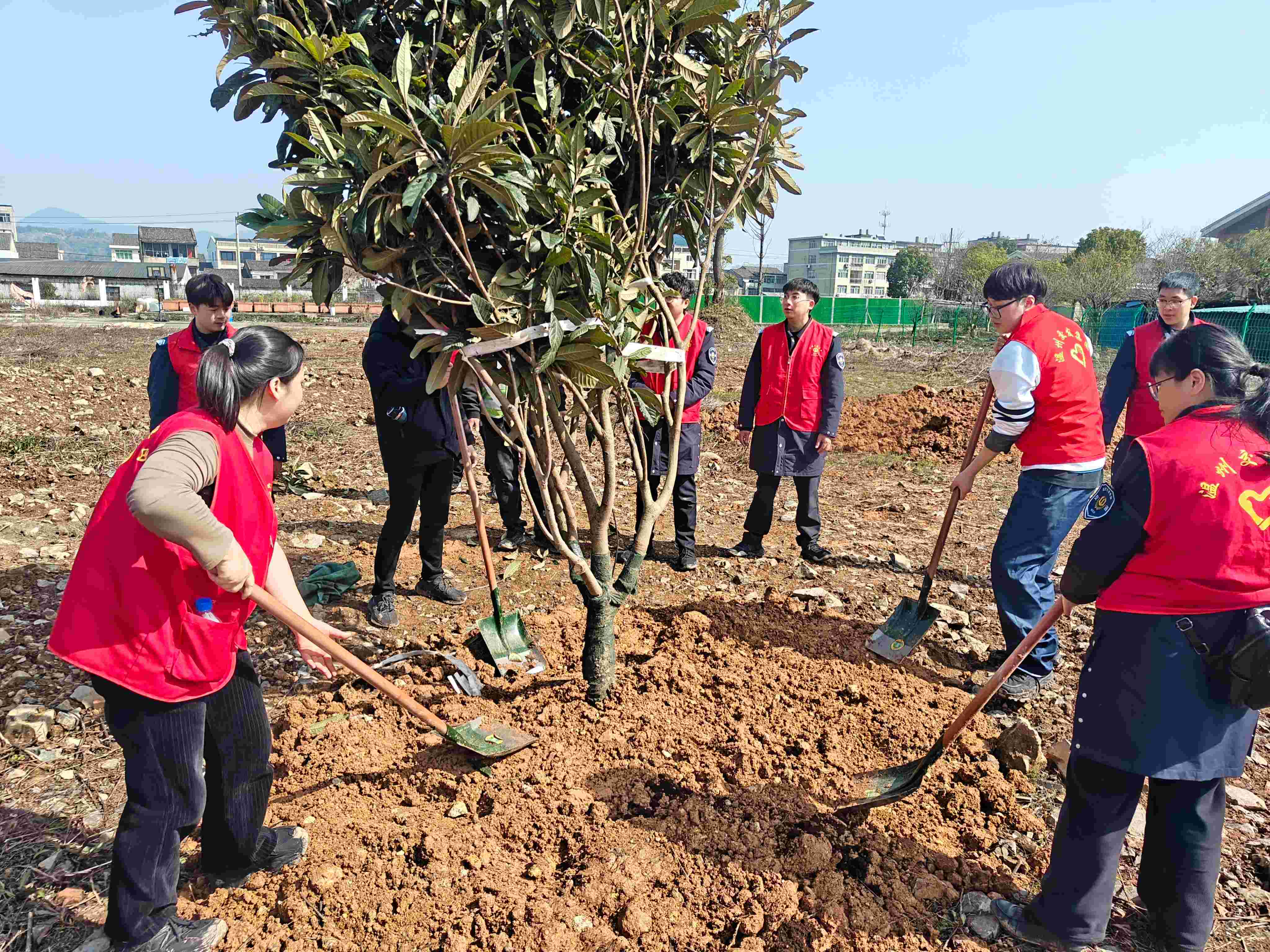 植树环节前,志愿者进行植树节由来、种植知识与操作技能讲解,传递“绿色环保”理念,提高志愿者们环保意识与种植技能。活动现场,志愿者精神饱满,默契配合,有的负责挖坑,有的负责培土,有的负责浇水,各个环节衔接有序。一棵棵树苗稳稳地植入土中,象征着生命和希望的小树苗在这片土地上生根发芽,焕发出勃勃生机。