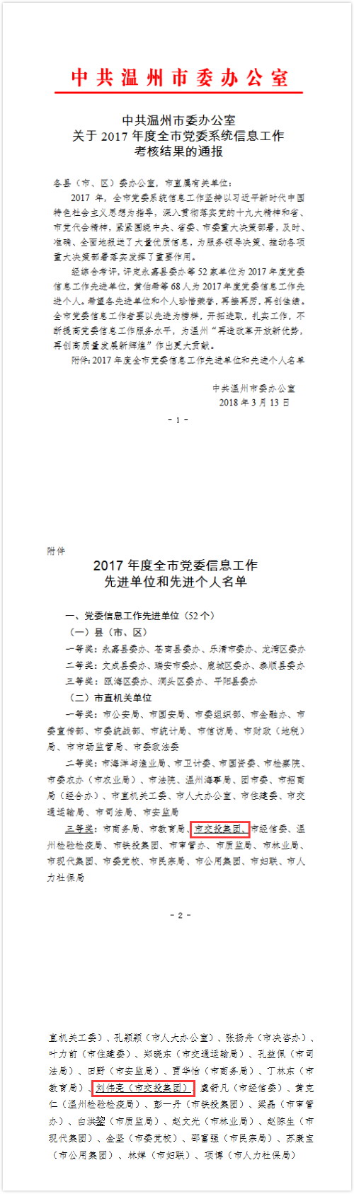 2017年度全市党委系统信息工作考核结果(先进单位三等奖:交投集团、先进个人:刘伟亮)
