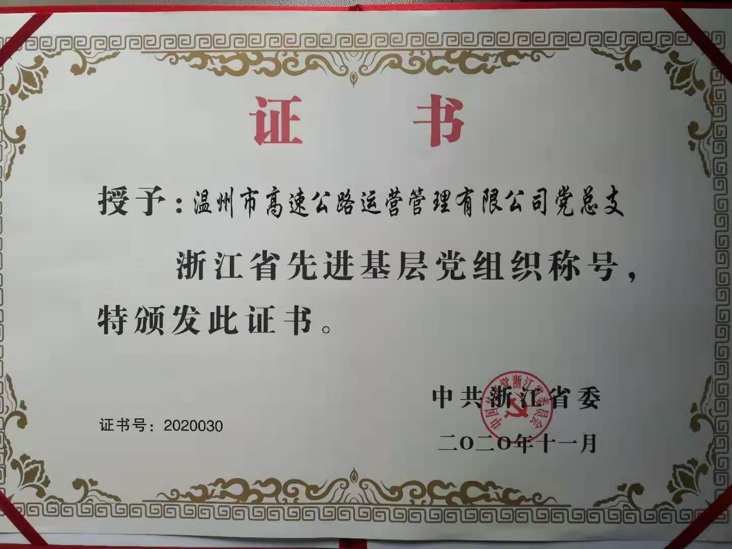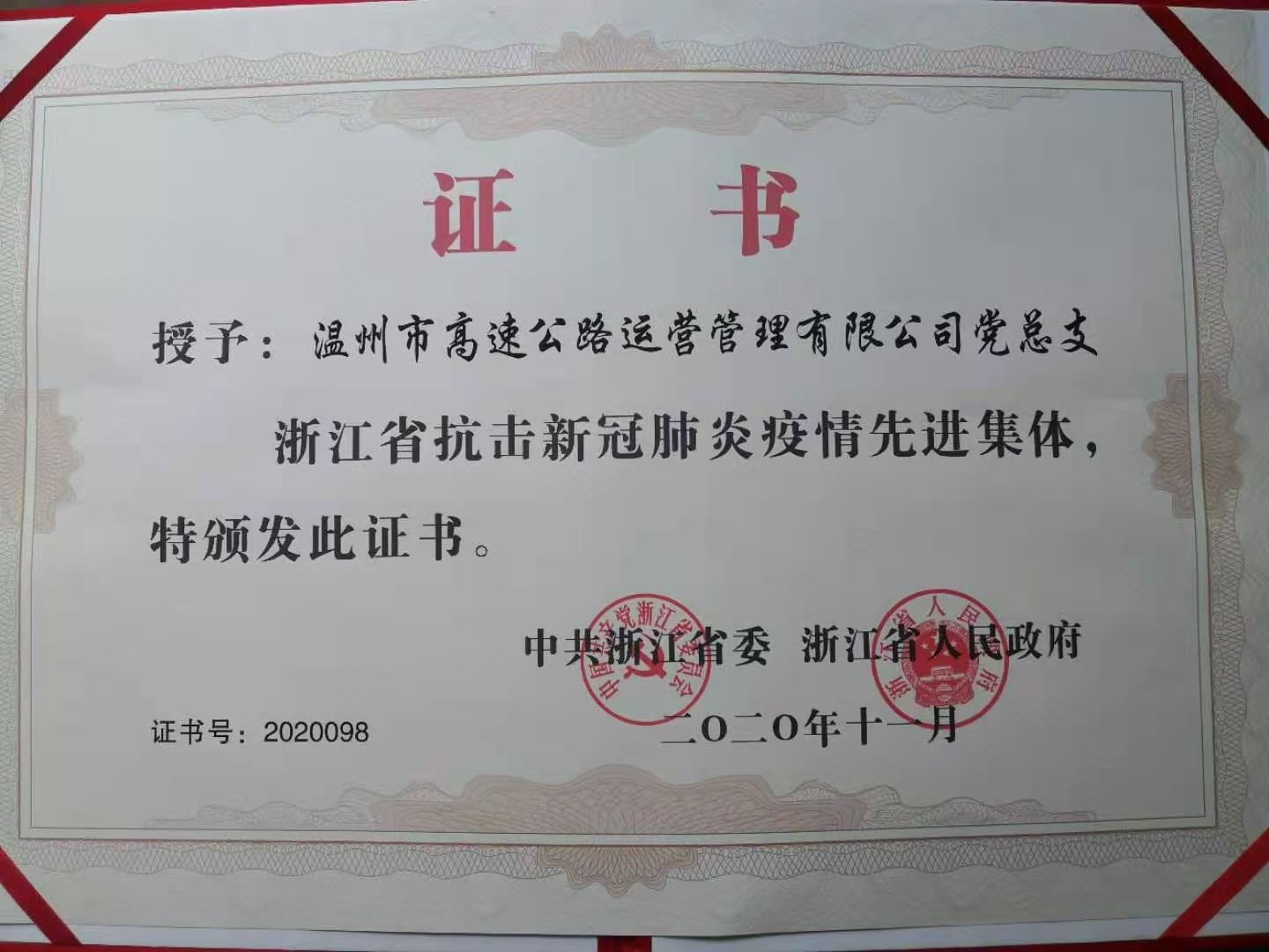 温州交发集团运营公司党总支在浙江省抗击新冠肺炎疫情表彰大会上获得表彰