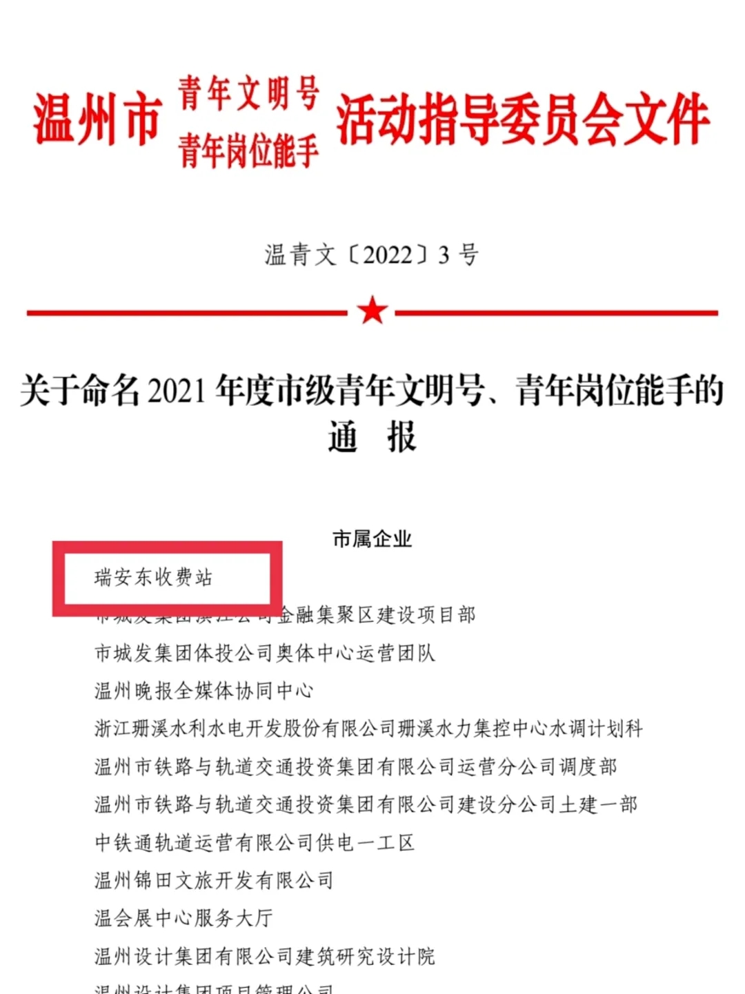 近日,温州交发集团运营公司瑞安东收费站、西片管理中心喜获2021年度“市级青年文明号”“市级青年安全生产示范岗”荣誉称号。