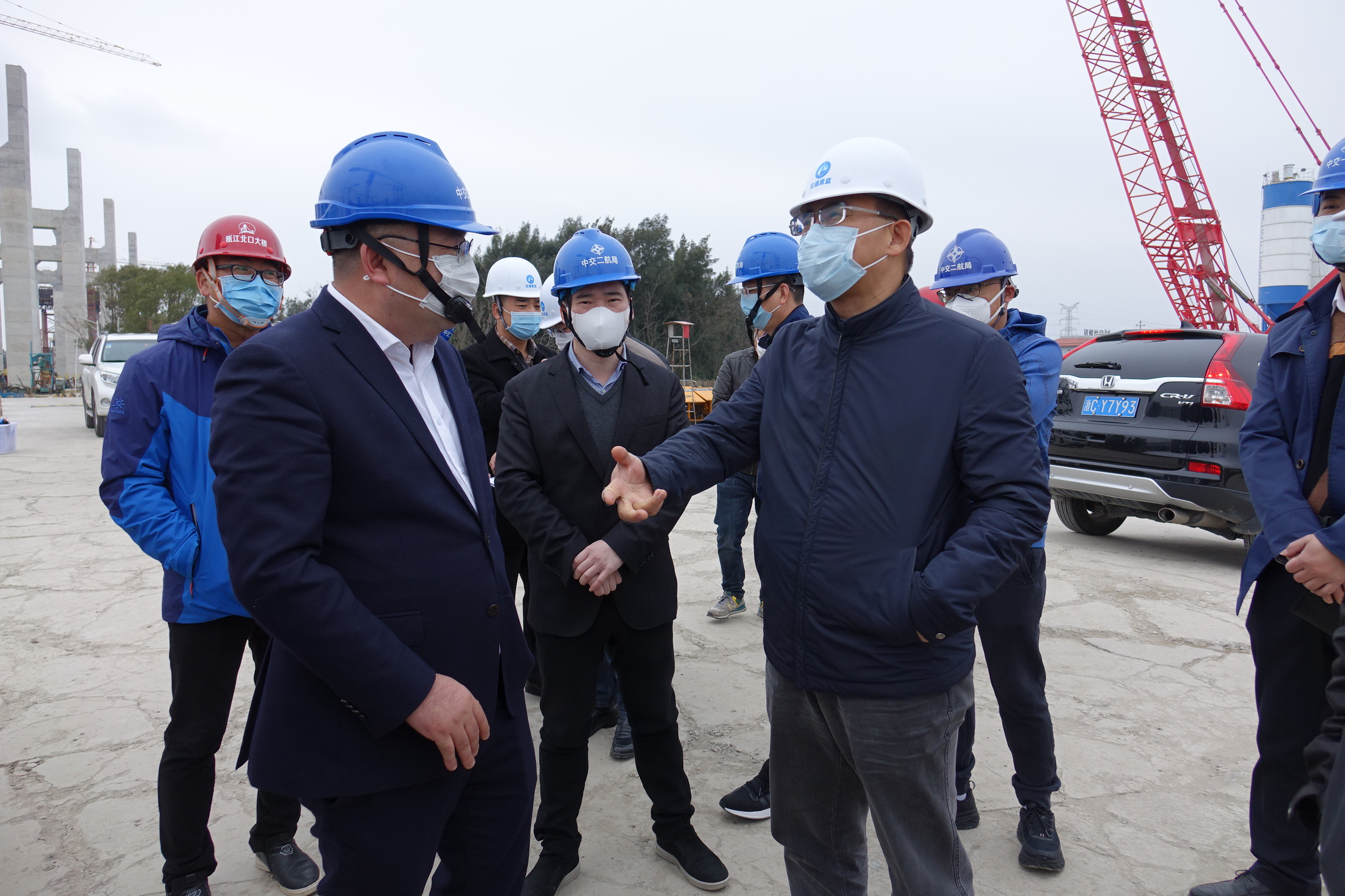 3月2日,省交通运输厅总工程师李志胜一行来到温州瓯江北口大桥开展全省交通建设工程“三服务”活动,市交通运输局副局长蒋理江,betway西汉姆联官方网站董事长朱三平、副总经理、总工程师郑锋利等陪同。