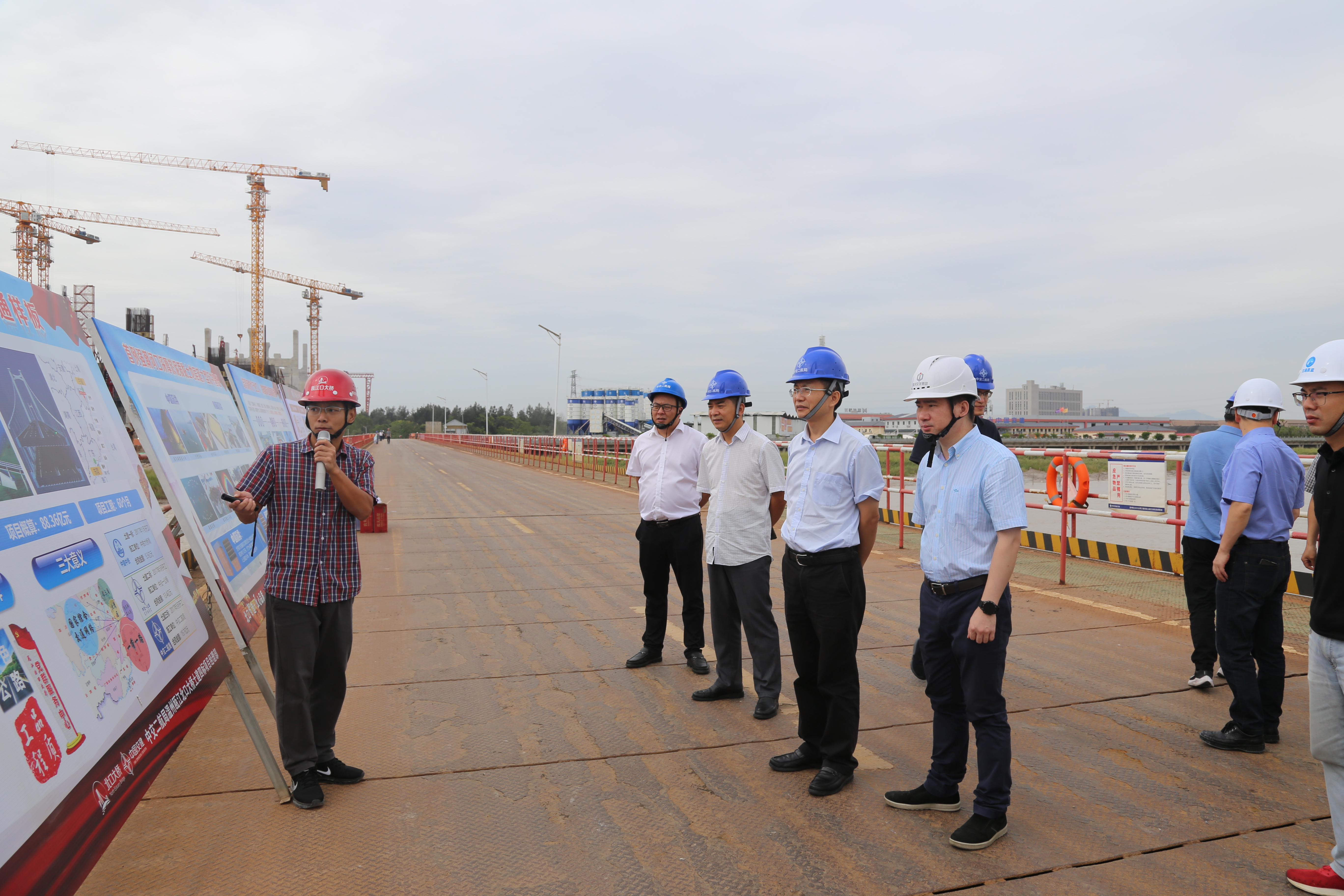项柳福一行来到项目土建三标南锚碇、南塔施工现场,认真听取项目概况、建设进度、质量安全管控及“党建+重点工程”等情况的介绍,同时详细询问了项目施工的难点。项柳福对北口大桥项目整体施工情况表示肯定,嘱咐大家在保障质量安全的前提下,加快施工进度,为推进项目建设工程贡献力量。