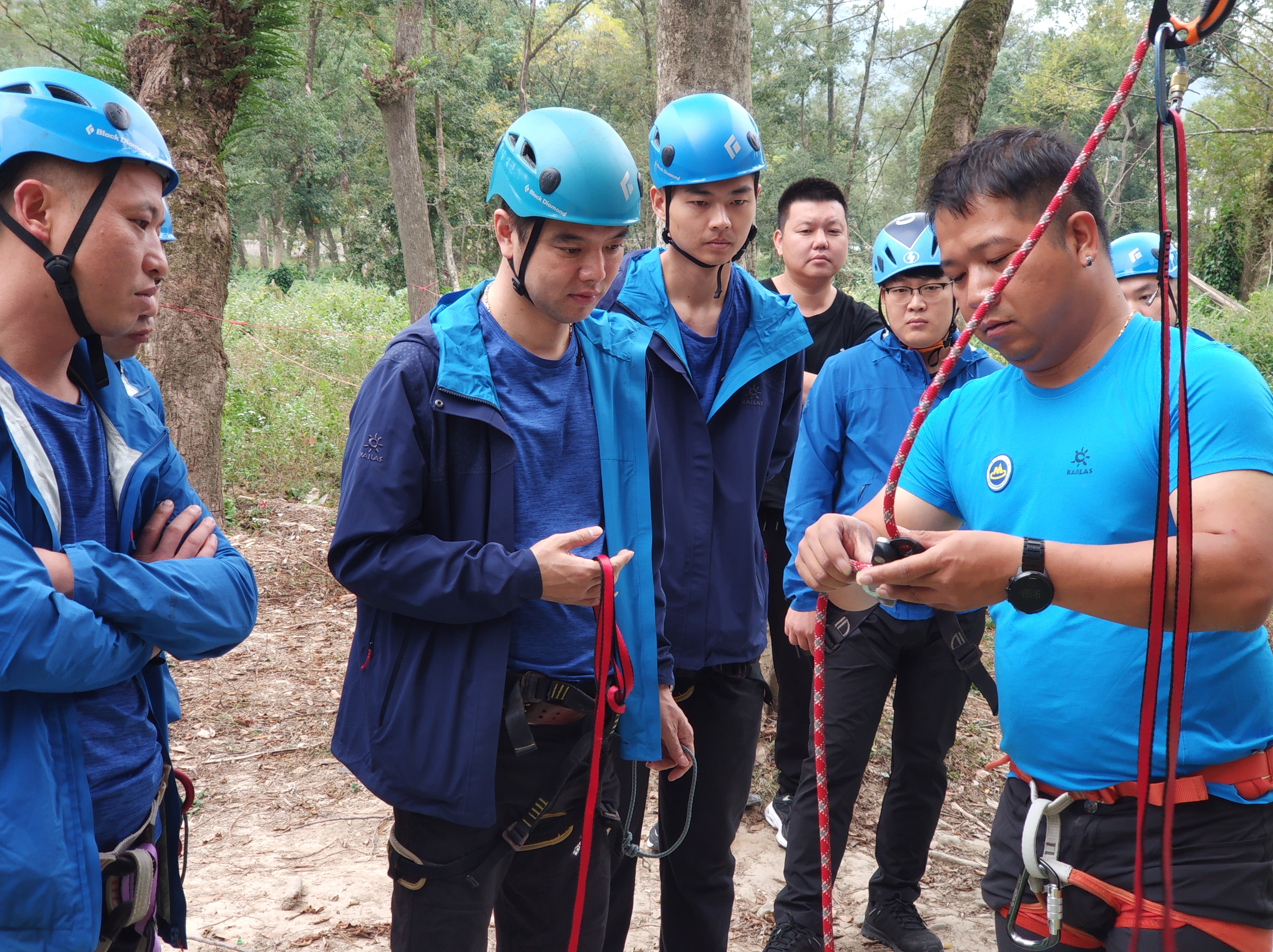 在经过前几期的练习和巩固,救援队大部分队员已经可以较熟练的掌握并运用基础卫星导航定向搜索、绳结技术、上升下降技术和紧急救护等技能。此次训练,重点要求队员了解掌握手式上升器、八字环等装具的使用,并能熟练运用SRT单绳上升转下降和挽复式双绳下降的技能。经过专业教练的指导,全体队员踊跃尝试,积极练习,努力克服四肢酸疼、体能下降等方面带来的困难咬牙坚持,全部独立完成计划设置的课目内容。