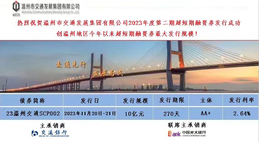 11月21日,betway西汉姆联官方网站2023年度第二期10亿元超短期融资券成功发行,票面利率2.64%,较1年期LPR下降了81BP,预计节约财务费用599万元,创温州地区今年以来超短期融资债券最大发行规模。